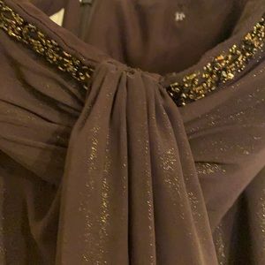 This is a stunning brown off-the-shoulder gown featuring beading across the front of the chest. While a few beads are loose, this is an easy fix, and the price has been reduced to account for that. The gown includes a lining, and the front of the bodice has a flowing chiffon drape that extends to the floor.