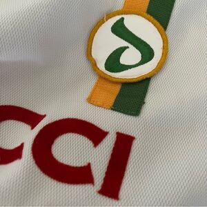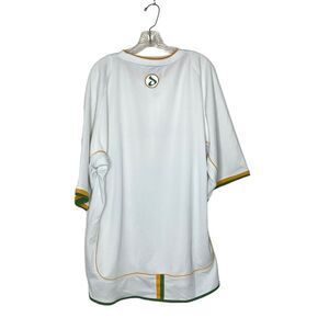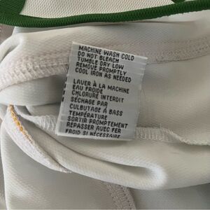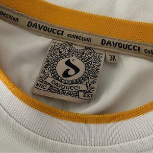 White jersey with red velvet "Davoucci" spell out on front. Yellow and green vertical stripes and logo patch down front left side. Approx measurements, 25” underarm to underarm, 33” long. Gently worn.
