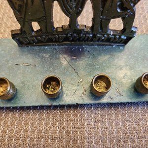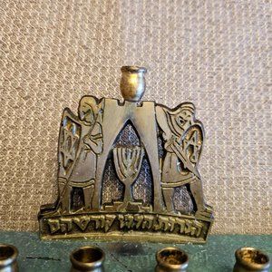 This beautiful DAYAGI brass enamel menorah is a vintage piece from Israel, perfect for collectors and enthusiasts of Judaism and religion in general. The intricate design and craftsmanship of this piece make it a unique and valuable addition to any collection. With a focus on quality and attention to detail, DAYAGI has crafted a truly stunning piece of art that will be cherished for generations to come. This menorah is perfect for display, use during religious ceremonies, or as a thoughtful gift for someone special. Don't miss out on the opportunity to own this exceptional piece of Jewish history. The base is made of enameled brass and the top piece is simply brass. It says "Hanerot Hallallu Kodesh Chem" which translates to "The Candles Were Bright, They Are Holy." It has two maccabees on it standing next to a menorah. There is some wear and scratches as shown in the photos.