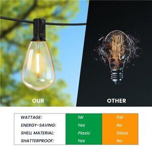 DAYBETTER 100ft Waterproof Outdoor String Lights use the LED bulbs which are only 0.6W and can be used for up to 30,000 hours. Additionally, The bulbs can offer a practical solution for outdoor lighting while adding a touch of style and elegance to your patio or outdoor space.