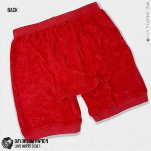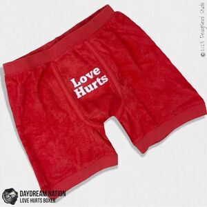 From the Valentine’s Day collection, this boxer short’s style is borrowed from the boys in Heartbreak Red French terrycloth fabric Made from super-soft terry cloth, the silhouette is a loose fitting, mid-rise cut with graphic text reading “Love Hurts,” placed crotch front and center. Wether it’s good or bad, it’s true that (sometimes) love DO hurt.