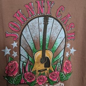 American country legend - Johnny Cash. With an unwavering outlaw style and smooth baritone voice, Cash and his famous tool of the trade spawned a long line of country hits that held such a place of prominence for American culture. Featuring all the iconography of his western roots, this boyfriend tee is designed with a guitar and rose graphic stamped with Cash’s name and deserving title of ‘American Legend.’ The ultimate tribute to the star whose name rings country sound everywhere.