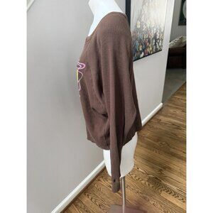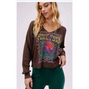 Trippy design of a cosmic pyramid and pink floyd's name in warped letters land center chest on this relaxed fit thermal. Designed with a notch neck and raw edge.