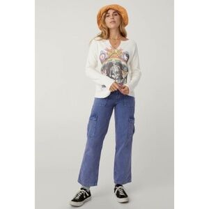 Notched V neckline ~ Long sleeves with raglan shoulder seams ~ Curved hemline ~ Pullover styling ~ Soft unlined thermal like fabric with a micro waffle texture to the fabric ~ Solid white … with a colorful retro design on the front with a skeleton at a keyboard, peace sign, doves, flowers, rainbows and more!