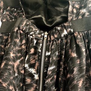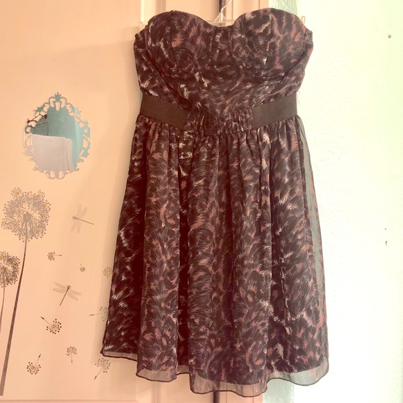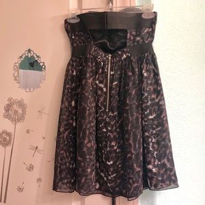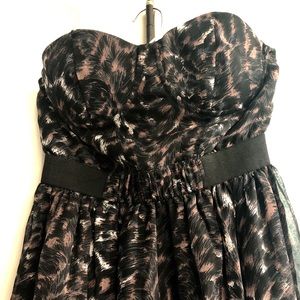 NWOT. Daytime Leopard print strapless semi balloon dress. Wide elastic in the back, leopard print sheer fabric with elastic belted style waist. Zipper from mid back down.