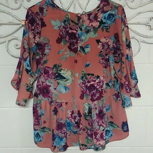 DAYTRIP FLOWY, FLORAL, COTTAGECORE BLOUSE WITH PEPLUM BACK & BELL 3/4 SLEEVES