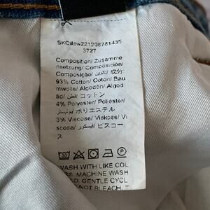 Denim jean midi skirt with medium wash by DAZY. This skirt has a raw hem with a pretty wash-work band along the bottom. It has the standard 5-pocket design, belt loops, and a button and zipper closure. It is pre-owned and in great condition.