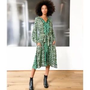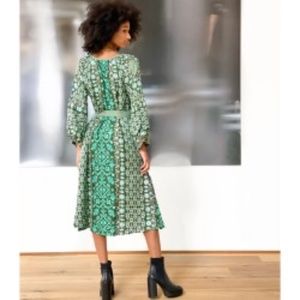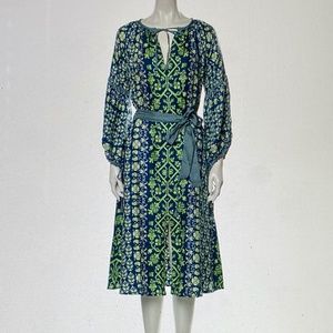 New D'Ascoli blue 100% silk midi dress with detachable waist-tie closure at front.Three quarter sleeves, side slip pockets and tie-neck. Size is small /