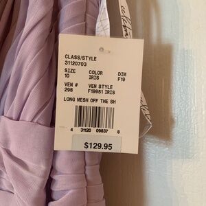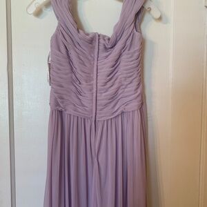 New with tags, never been worn or even tried on! David's Bridal bridesmaid's dress made with mesh fabric in color iris. Size 10. Floor length dress with front slit, off the shoulder neckline.