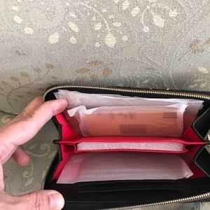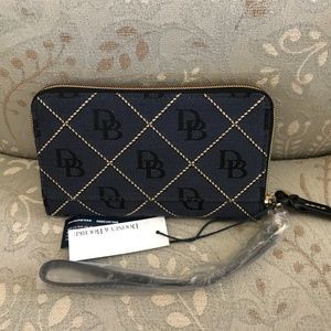 Dooney & Bourke phone wristlet that opens up like an accordion and closes with a secure zip.