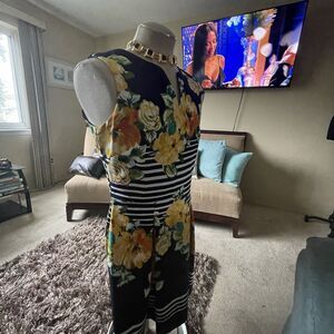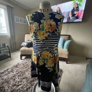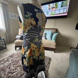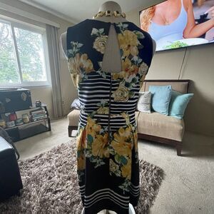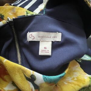 DB Estb 1962 Navy White Yellow Spring Summer Floral Striped Pleated Dress Sz 16