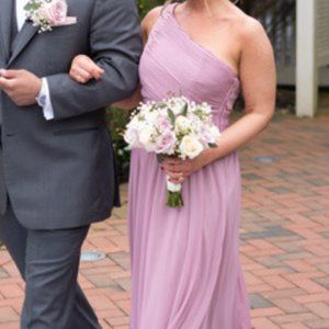 Beautiful David’s Bridal bridesmaid or occasion dress in dusty rose. Precise, narrow pleats detail the bodice and waistline of this airy mesh one-shoulder dress. Worn once, perfect condition with no signs of wear and tear.