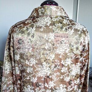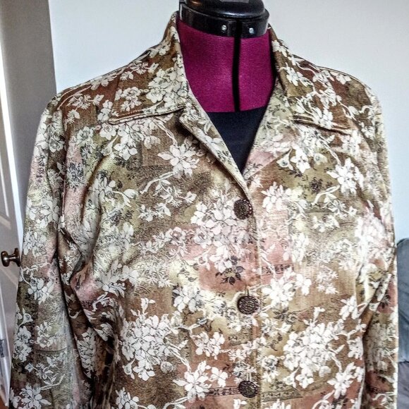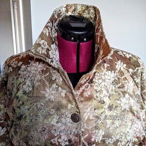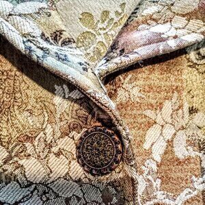 This comfortable jacket from DB Sport features a Japanese-inspired print on beige and tan jacquard fabric with distinct metal seed buttons.