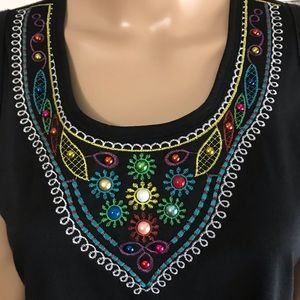 DB Sport SZ LG. Measures 27” in length from shoulder to bottom of hem. Bust measures 19” from armpit to armpit. 60% Polyester, 32% Rayon and 8% Spandex. Features beautiful beading in the front as well as stitching. Super cute.