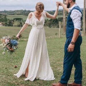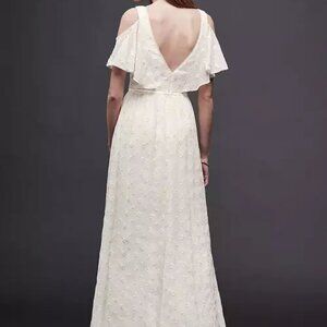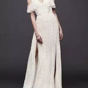 David's Bridal off white V-neck Cold shoulder ruffle, eyelet wedding dress