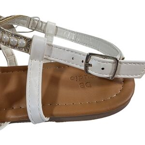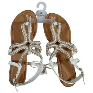 NWT DB Studio Jelena sandals in Ivory, size 9. Sparkly pearl + rhinestone loop T-strap, adjustable buckle, comfy footbed—great for bridal, prom & special occasion looks.