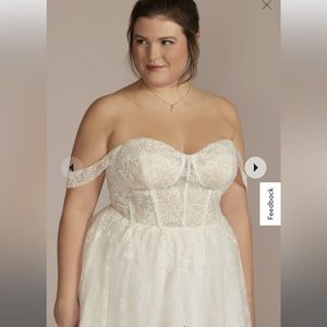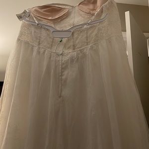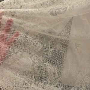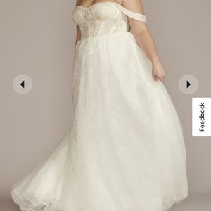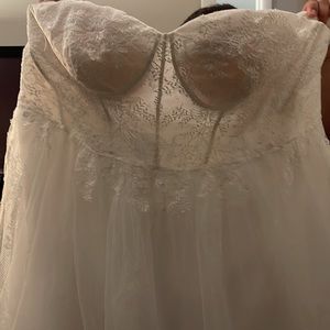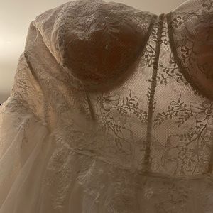 Never worn, I could not alter the dress so I did not wear it it was also a back up dress. Hoping to send this to a beautiful lady this dress felt gorgeous on NOTE* sleeves never came with the dress for me didn’t realize until it was too late