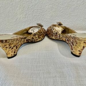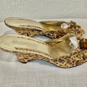 DBDk Fashion animal print, open-toe mule heels with rhinestone embellishments. Adorable very unique vintage shoes. Do not know what material these are made from but sure not leather. Size 8 regular