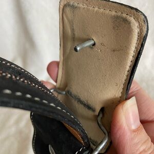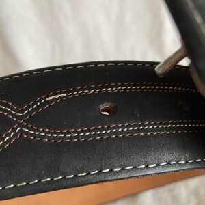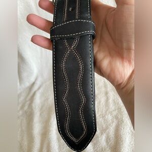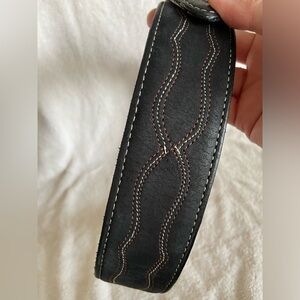 Heavy quality leather with two tone embroidered accents and large built in buckle