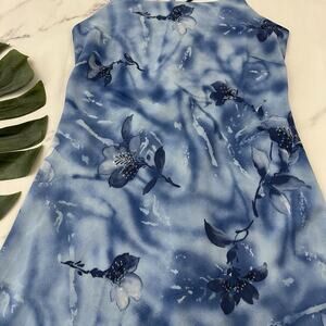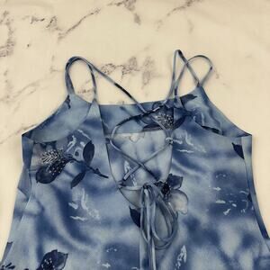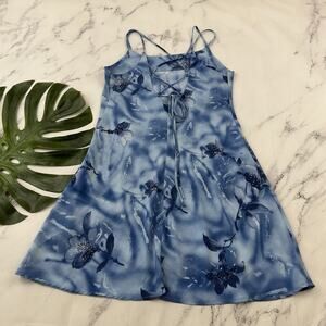 DBY women's vintage y2k blue floral lace up back mini slip dress, size 12 p. It is free from any rips or stains. It measures about 38 inches around the bust, about 36 inches around the waist and is about 35 inches long.