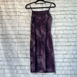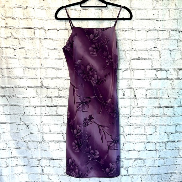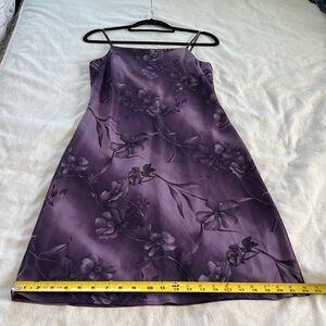 DBY gorgeous purple floral fabric design simple yet lovely midi/mini slip dress w/spaghetti straps homecoming out to dinner. Throw a little mini blazer or sweater & you could even wear it to work