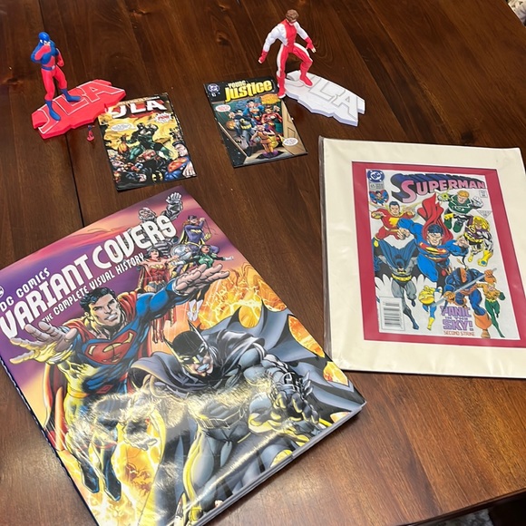 DC figures - $10 each, wall art with matte - $15, DC Complete Visual History book - $25. Will create separate bundles if requested.