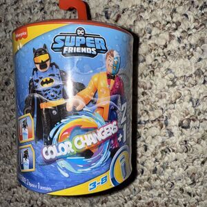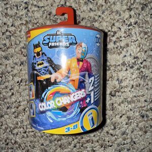 The product is a DC Color Changers Batman and Two-Face Mini-Figure 2-Pack by Fisher-Price, manufactured in China in 2022. The set is recommended for children aged 3-8 and belongs to the Character Family of Batman. The figures are factory sealed, ensuring they are new and unused. The Color Changers aspect suggests that the figures may change color in response to different stimuli, adding an interactive element to playtime for young children. This set would be a fun addition to a child's toy collection, allowing for imaginative play with iconic DC characters.