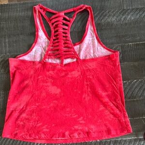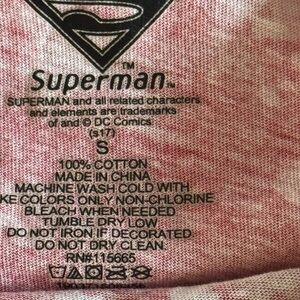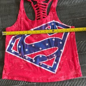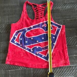 Vibrant red tank top with bold Superman logo. Blue and white star accents. Racerback design.