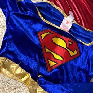 Features a rich blue velvet top with the iconic “S” emblem, metallic red skirt, and attached gold-trimmed cape. The stretch fabric provides comfort and flexibility for Halloween, cosplay, or themed parties.