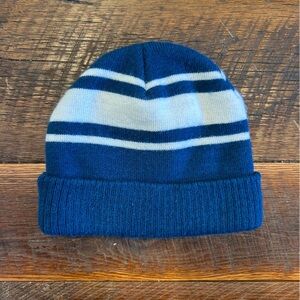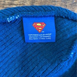 Cozy knit beanie with Superman logo. Blue and white stripes. Perfect for young fans.