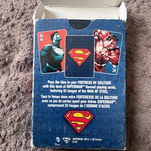 Deck featuring Superman comic art on the tuck box. Vivid primary colors and iconic S shield. Collector-friendly design for fans of DC Comics. Preloved condition