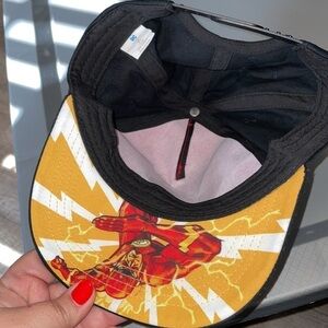 DC Comics The Flash SnapBack Baseball Hat OS. Red and black. Cool graphic on underside of brim. Logo Flash lightening bolt on front. Small discolored spot on one side. See pictures. Good preowned condition. Logo is like rubber patch.