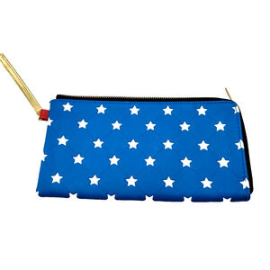 Showcase your heroic side with this DC Comics WONDER WOMAN wristlet organizer. The blue and white star pattern adds a patriotic flair to the rectangular faux leather bag, which has a zip closure and gold hardware. Measuring 9 inches in width, 5 inches in height, and 1 inch in depth, this small wristlet is perfect for carrying essentials on-the-go. The gold wrist strap adds a touch of elegance to the overall design.