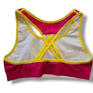 Bold Wonder Woman girls sports bra. Pink with yellow trim & logo detail. Size XL (14/16). Polyester nylon spandex blend for stretch & comfort. New with tags, never worn.