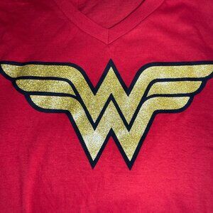 DC Comics Wonder Woman Girls Top w Cape, SS Glittery Gold W Cosplay Halloween, L
