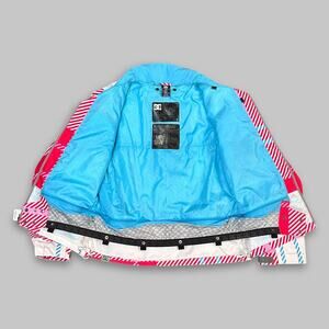 Note: This DC Exotex 10,000 snowboard jacket features a bold red, pink, and blue plaid pattern with a bright sky-blue lining. Ideal for skiing, snowboarding, or cold-weather outdoor activities. Please review all photos for details; colors may vary slightly due to lighting.