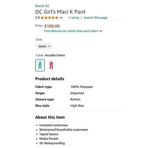 DC Girl's Maci K large mint green snow pants waterproof tapered insulated