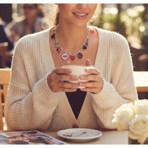 Design: Silver-tone chain ✦ Multiple enamel pendants (hearts, skull, lipstick, mallet, diamond, spade) ✦ Lobster clasp closure