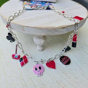 Featuring bold enamel pendants—hearts, skull, lipstick, Harley’s mallet, red/black diamond, & spade—dangling from a silver-tone chain.