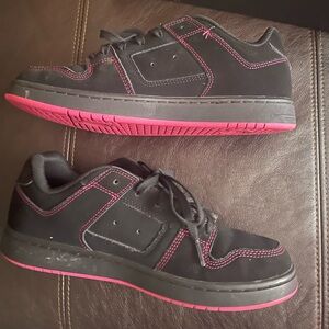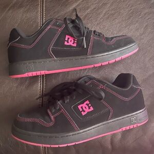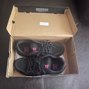Sleek black skate shoes with pink DC logo. Perfect for everyday wear.