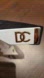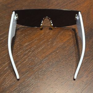 Stylish sunglasses with a bold DC logo. Features black lenses and white frames with gold accents.