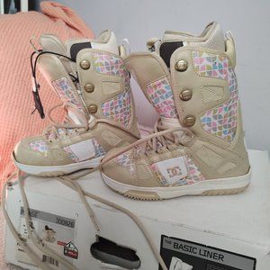 WOMENS US 6/ UK 4. Will fit women's 5 up to a 6. I wear 6 to 6.5 and these are too tight on me These boots have a pretty pastel pattern on a sand/white color scheme. Very cute in person!! I got them down from the attic to post in "like new" condition... I bought them new and literally used lightly for 2 days. Snowboarding isn't my thing... HOWEVER, apparently it got hot up there and loosened the glue on the bottom of the exterior sole. Boots are great quality. Seams/stitching all sturdy/intact. Padding is good. Laces are great other than a tiny snag and a smudge. Please see photos. These could be great boots for someone who can use an appropriate purpose adhesive to secure the exterior rubber soles to the boots. Feel free to ask any questions