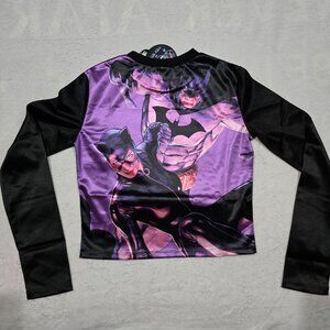 Featuring Batman and Catwoman in a vivid purple & black palette, this fitted long sleeve top tells a tale of daring escapades, rooftop rendezvous, & midnight mischief.