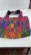 This reversible tote bag features a striking design with vibrant colors on one side and a sleek, solid dark gray on the other. Its rounded shape and short handles make it a versatile accessory for any occasion.