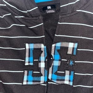 DC zip up hoodie. Black with white stripes. Logo is blue plaid. Boys M. Like New