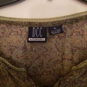 Beautiful, vintage, elegant top from DCC Junior. It looks green but due to the pretty paisley pattern also has browns and yellows. Slightly used but in great condition. Has a tie on the front and flowy, frilly sleeves. Size XL but on adult fits more like M/L.