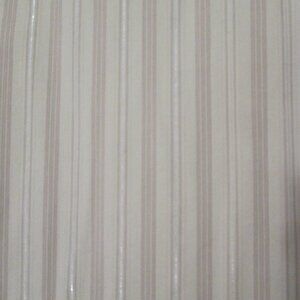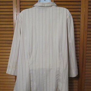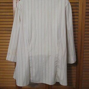 DCC brand - Woman's stretch button down top with 3/4 length sleeves and a V neck. Front has 2 pockets and top has front and back tailored seams. Colors are tans, beige with a thin silver thread throughout the blouse. Like new condition. (New without tags)