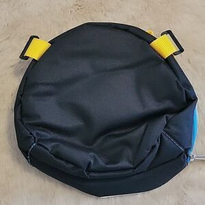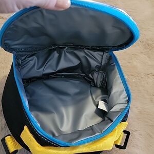 DC Comics Batman black and turquoise backpack set includes insulated lunch bag measuring 8" across by 2", backpack measuring 16.x12x4 , supply case measuring 9"x6", ice pack, carabiner and keychain with "Dark Knight" logo, padded back, side mesh water bottle pockets.