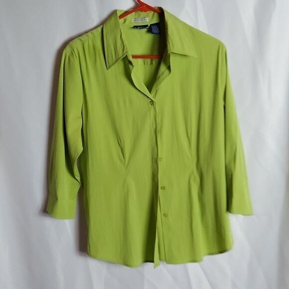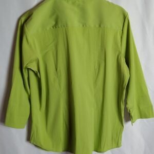 Green, fitted stretch blouse. 3/4 cuffed sleeves. Polyester nylon spandex blend,. Chest 22" length 28". AA