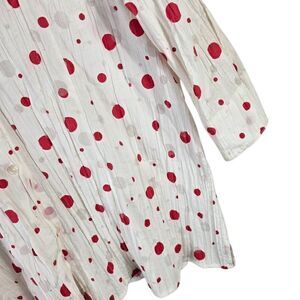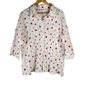 Add a playful touch to your wardrobe with this charming white blouse adorned with vibrant red polka dots. Featuring a lightweight, crinkled texture for easy wear and a relaxed fit, this button-up top has a classic collar, 3/4 length sleeves, and a slightly flared hem for a flattering silhouette. Perfect for casual outings, retro-themed looks, or layering, it blends comfort and whimsy with effortless style.